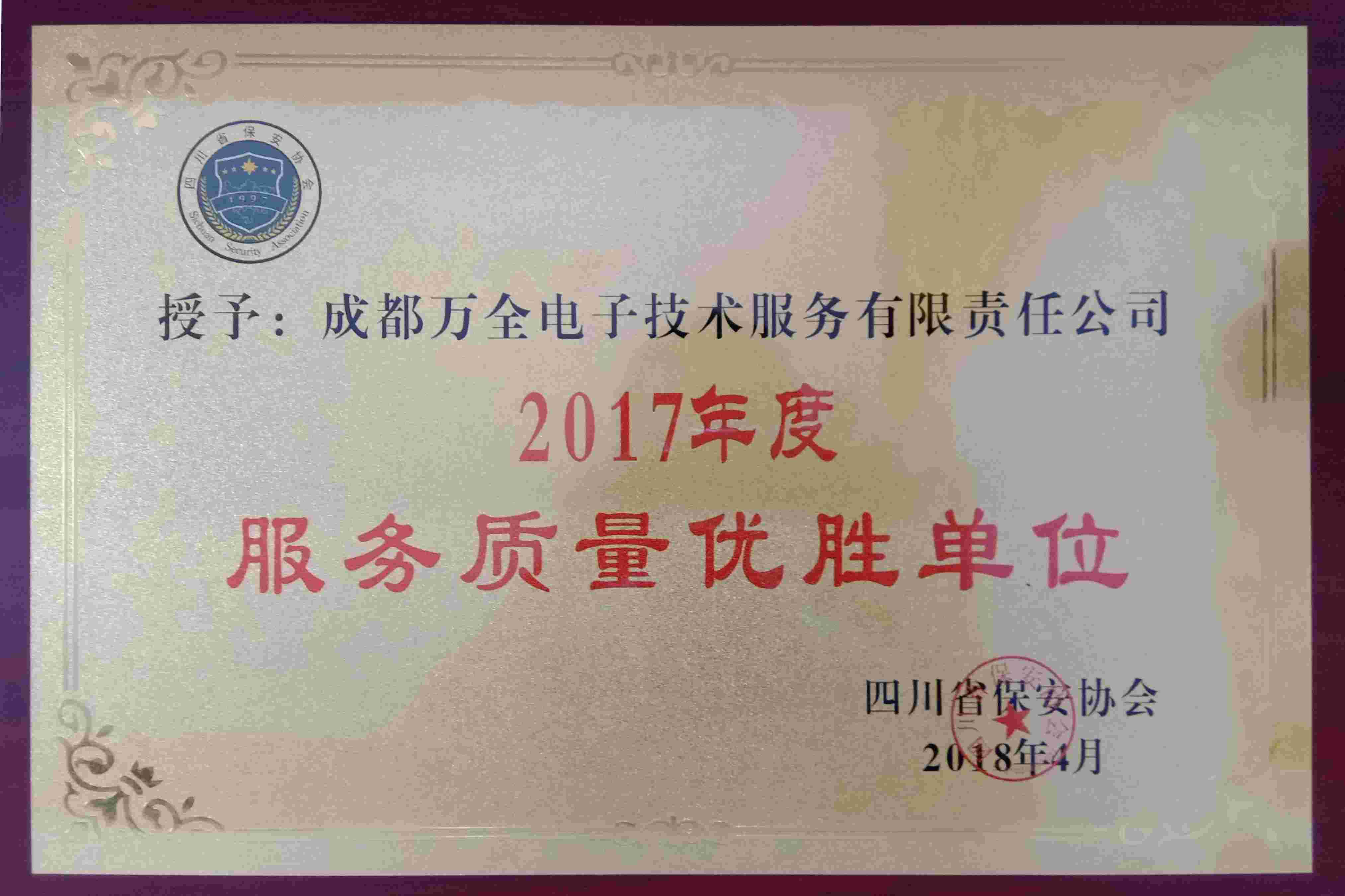 2017年4月四川省安保協(xié)會授予成都萬全電子“2017年度服務質量優(yōu)勝單位”稱號