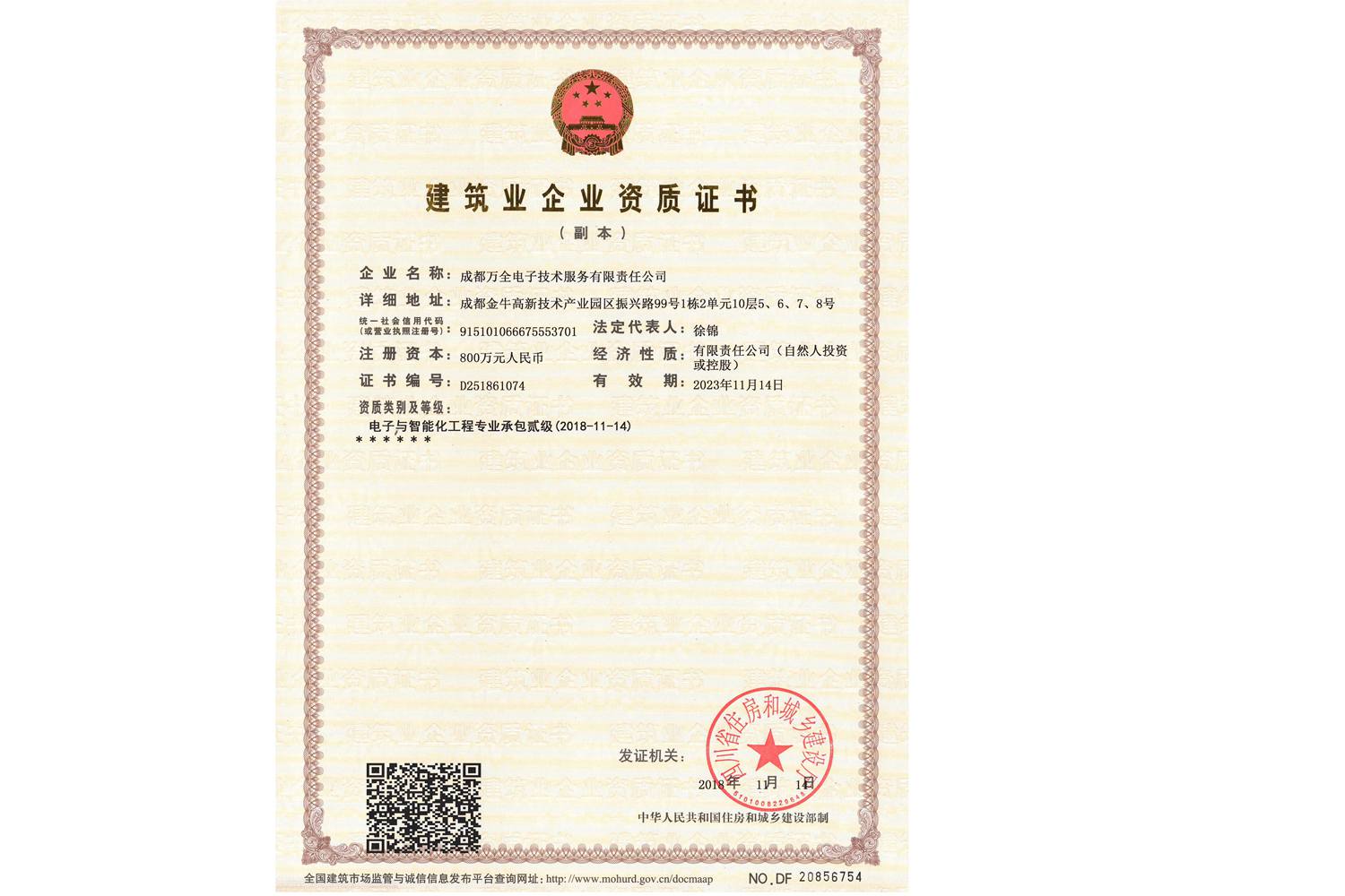 安防工程公司成都萬全電子取得建筑企業(yè)資質